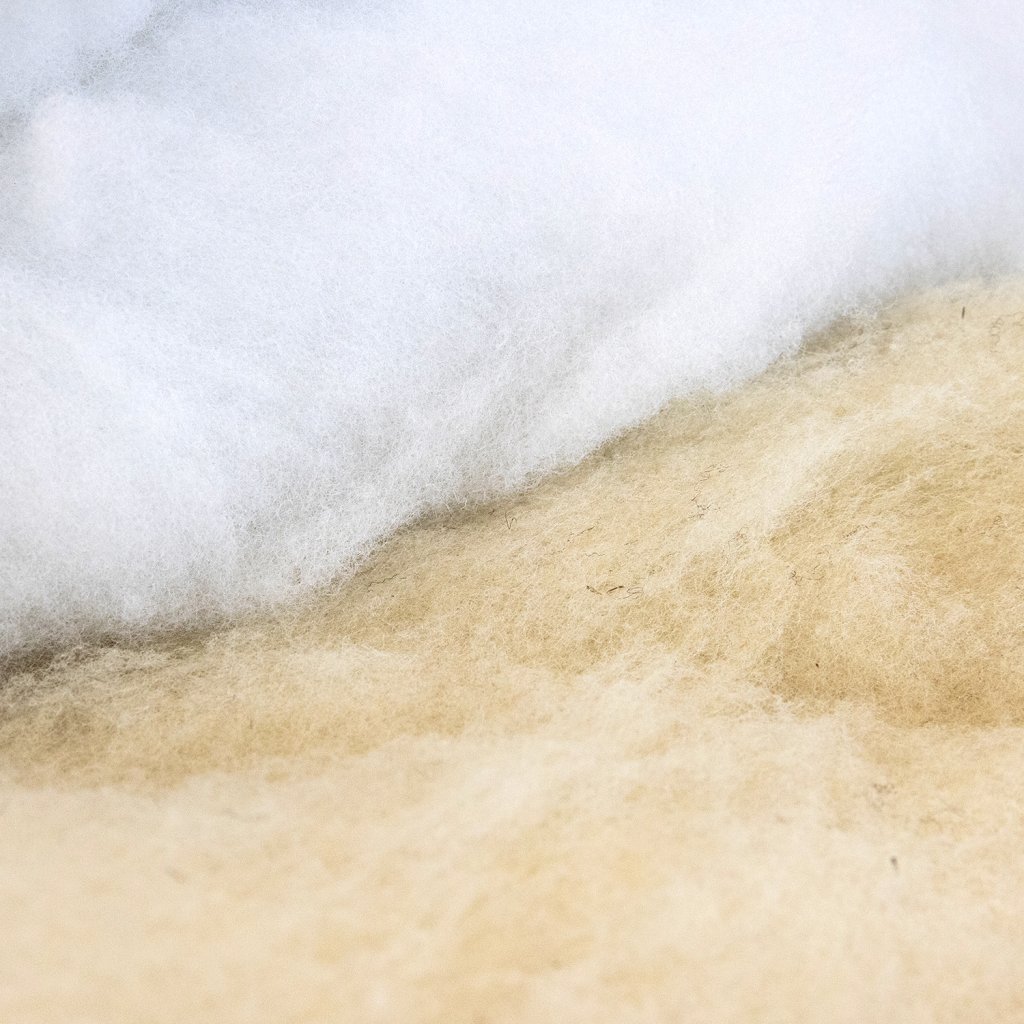 Naše materiály na polštáře Náplň vlněných polštářů tvoří 100% ovčí vlna (plemene merino) z místních ekologických chovů. Ručně mykané vlněné rouno není chemicky upravované a jde o čistě přírodní materiál z plně obnovitelných zdrojů. Jeho antibakteriální vlastnosti jsou trvalé. Naše rouno je kompaktní díky dostatečnému vyválcování v naší manufaktuře. Rouno je pečlivě uchyceno, nepohybuje se – prošíváme je vodorovně tak, aby se neshrnovalo a švy netlačily. V polštářích, kde kombinujeme rouno s jemným vícedutinkovým dutým vláknem, používám pouze velmi kvalitní a nerecyklované duté vlákno. Naše povrchové materiály jsou bez příměsí, vše je 100% hebká (dlouhovlasá) bavlna. |
