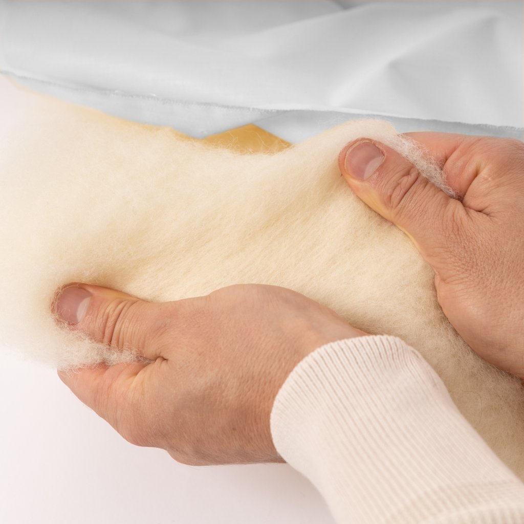 Naše materiály Náplň tvoří 100% ovčí vlna (plemene merino) z ekologických chovů. Ručně mykané vlněné rouno není chemicky upravované a jde o čistě přírodní materiál z plně obnovitelných zdrojů. Jeho antibakteriální vlastnosti jsou trvalé. Naše rouno je kompaktní díky dostatečnému vyválcování v naší manufaktuře. Rouno prošíváme do čtverců, což vylepšuje celkový pocit pohodlí (oproti kruhovému prošívání, které může dát pocit tíhy). Povrchový směsový materiál 50% bavlny + 50% polyesteru. Naše přikrývky vás doslova obejmou ke spánku. |